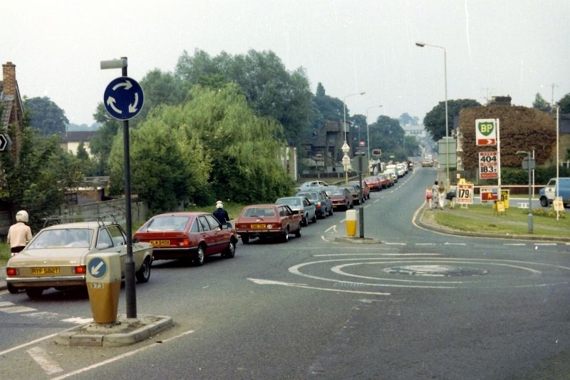 Traffic at the crossing. Franks garage, petrol 40p a litre. 1992