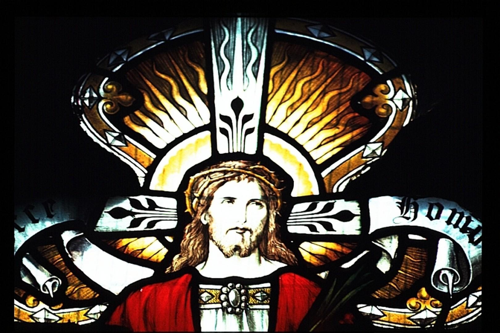 Stained glass window, St James, Stanstead Bury. Photo 1980