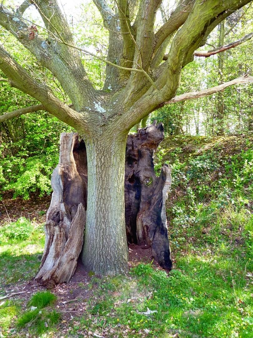 All that's left of the old oak with a new tree growing from the ashes. April 2011