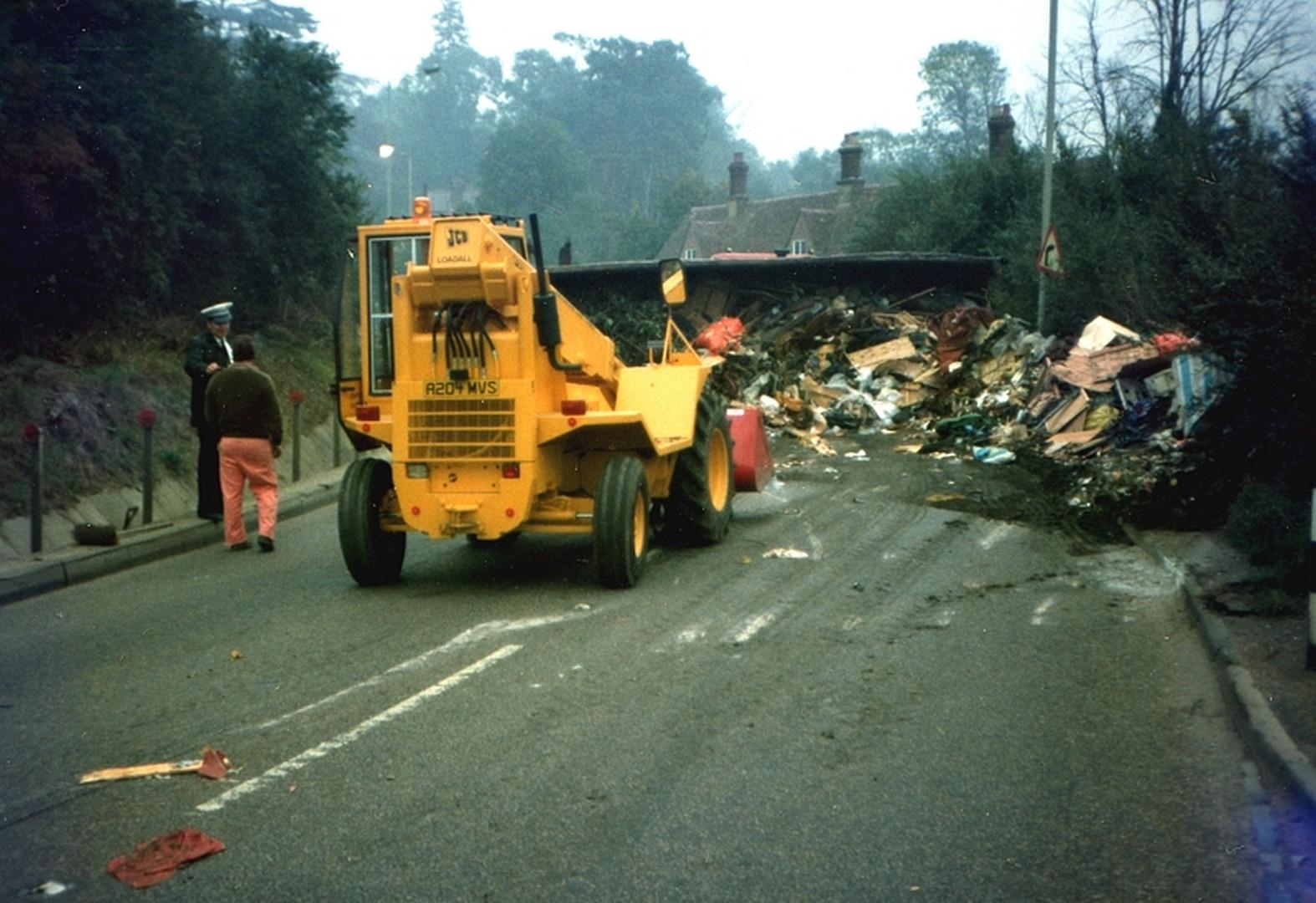 Roydon Road Stanstead Abbotts. Yet another calamity at the bottom of Cats Hill. After many hours the trailer was finally turned upright and reloaded. The lorry went another 100 yards and then stalled. A breakdown team finally managed to restart it. Photo about 1980 ?
