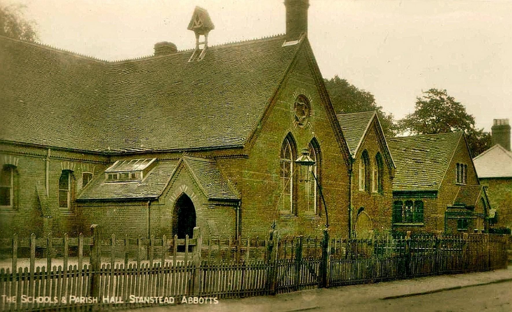 Stanstead Abbotts school. Note the bell on the roof, where did it go? Dates to 1918 or earlier due to postage rate on card.